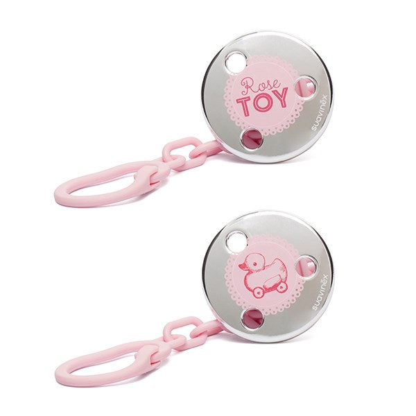 - The clip, which fastens to baby's clothes, has a ring to attach it to the soother.