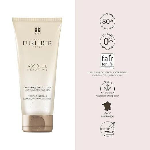 "Rene Furterer Absolue Kératine Renewal Shampoo is a sulfate-free and silicone-free shampoo that gently cleanses and repairs extremely damaged and brittle hair, making it stronger, revitalized, and easy to detangle.