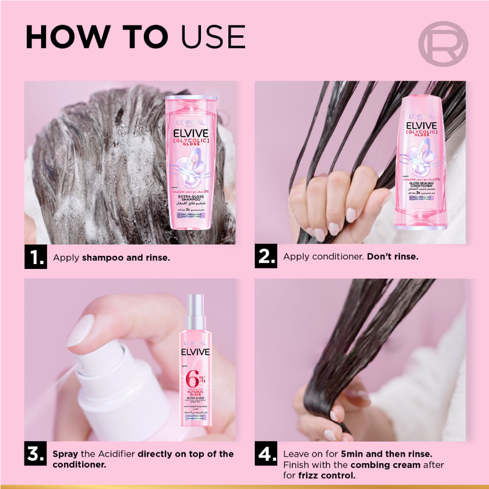 • Boost your hair’s shine using the new Elvive Ultra Gloss Acidifier by L’Oréal Paris. Enriched with glycolic acid, our 1st at-home hair glossing service improves the quality of dull, damaged hair.