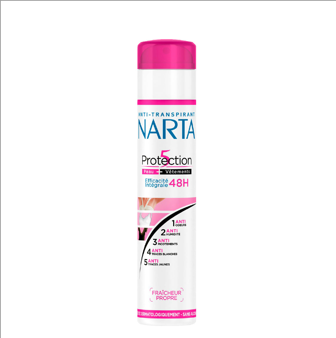 NARTA Protection5 antiperspirant Spray deodorant 5 in 1 action: anti-odor, anti-humidity, anti-irritation, anti-white marks and anti-yellow stains. Its clean freshness guarantees you a lasting feeling of well-being. It respects your skin and the natural mechanism of perspiration. Dermatologically tested.