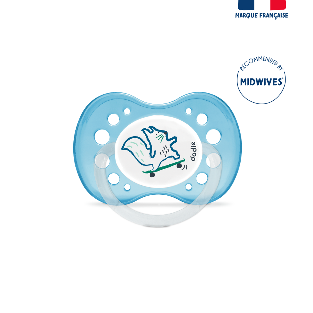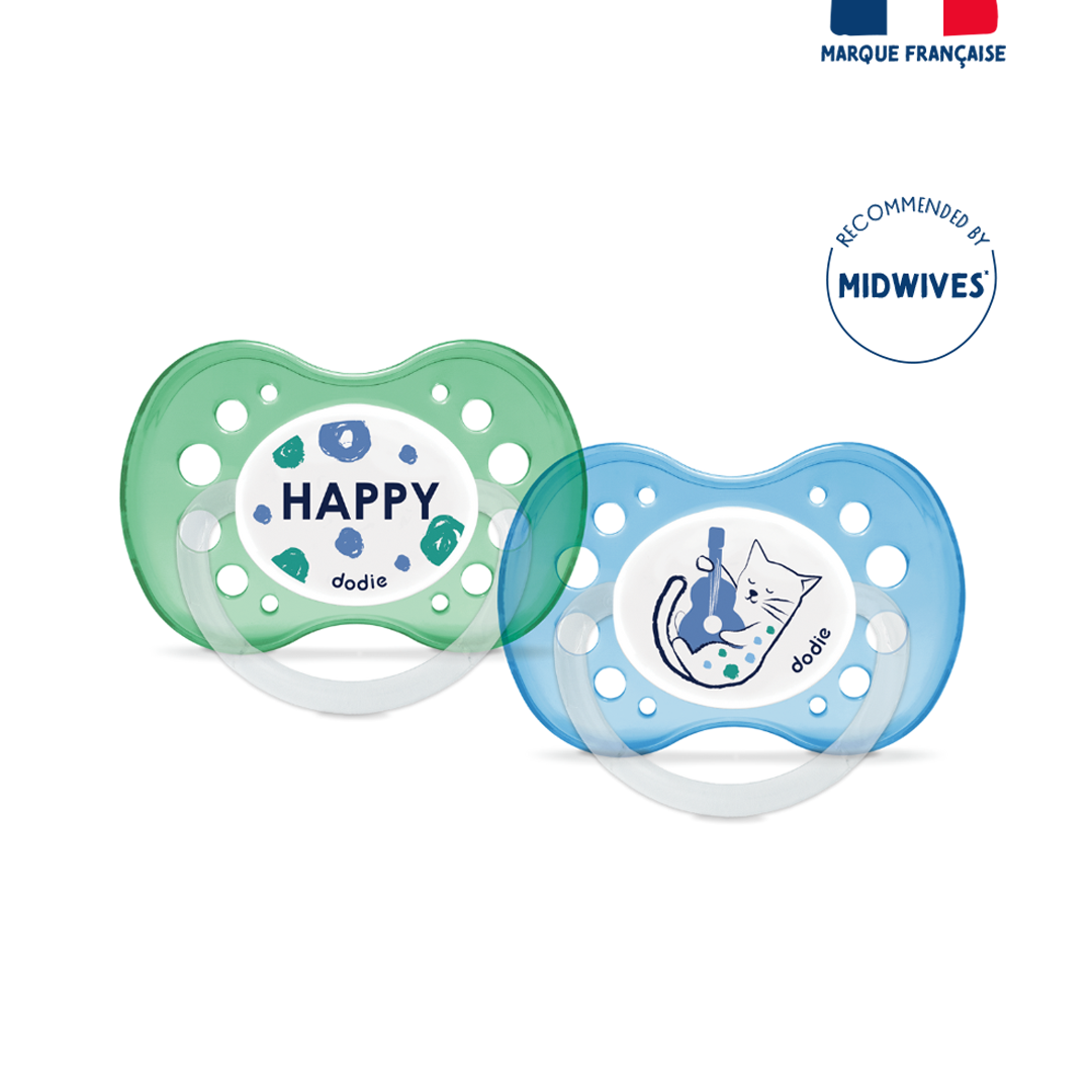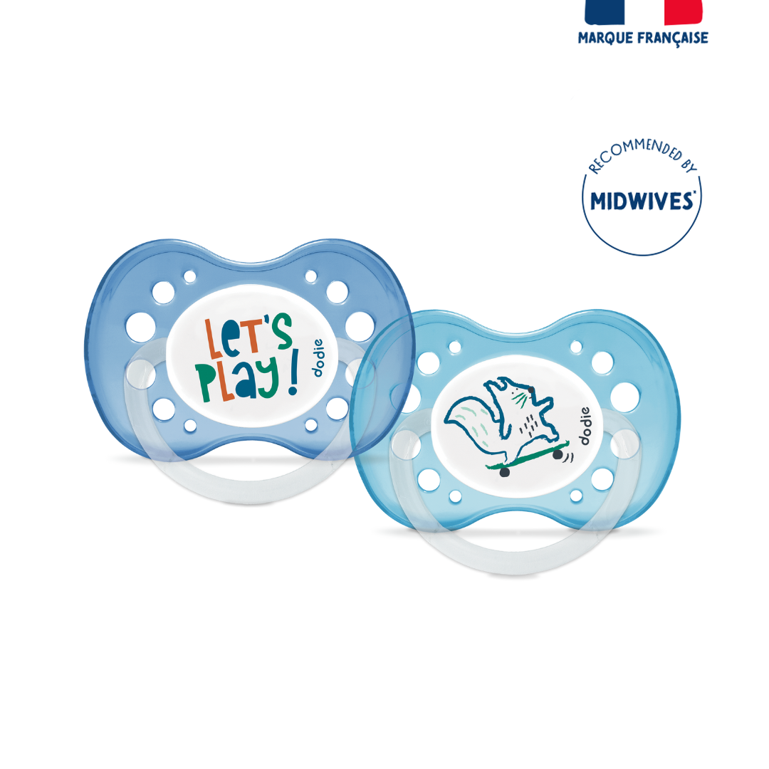 Set of 2 anatomical soothers, for babies aged 18 months and up. Designed with experts, their symmetrical shape promotes proper positioning in the mouth. The ribbed silicone teat withstands the arrival of baby’s first teeth. The lightweight and ventilated shield allows for easy retention in the mouth and reduces the risk of irritation.Before first use, immerse the pacifier in boiling water for 5 minutes, then let it cool. Alternatively, sterilize with cold water using sterilization tablets.